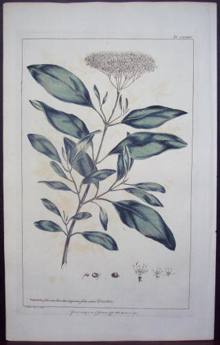 Phillip Miller: "Viburnum," Plate CCLXXIV. Original 1758 Hand-Colored Botanical Copperplate Engraving from Figures of the Most Beautiful, Useful...Plants Described In The Gardeners Dictionary. Very lightly toned with light staining from another print over image; sheet measures 15 7/8" x 9 7/8;" platemark is 13 1/4" x 8 1/2." - $200