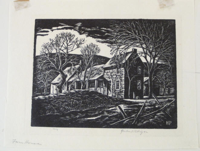 Herbert Pullinger: "Farm House" Original Signed Woodcut. Philadelphia, USA, 1878-1950. Signed 'HP' in plate lower right and in pencil impression 'Herbert Pullinger' lower right. Plate size: 5" x 6 3/4." Paper size: 6 3/4" x 8 1/2." - $225