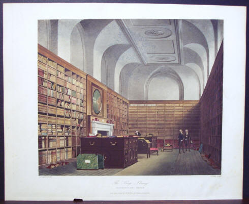 W. H. Pyne: "The King's Library, Buckingham House" Hand-Colored Aquatint Engraving, 1817. Light foxing present; hole in bottom margin. Sheet Measures 10 1/2" x 13." - $350