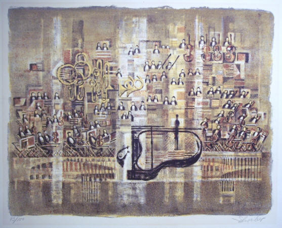Georges Schreiber: "Cadenza" Original Pencil-Signed and Numbered Color Lithograph, #43/100. The original Associated American Artists card is affixed to the back of the board. Laid down on board with some window toning and abrasions. Glue remains in margins no closer than 1/2" out from the window line. Sheet measures 20" x 25 3/4; Matting is 24" x 28;" Mat Window is 17 1/4" x 21 1/4." - $375