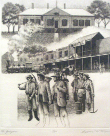 Donald Sexauer: "The Gold Years," Intaglio Pencil-Signed and Numbered Etching on Arches Paper, #11 of 50 from the 1975 "Mecklenburg: A Bicentennial Folio." Measures 13 3/4" x 11 3/4." - $175