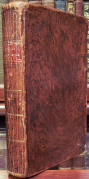 A New Work Of Animals: Principally Designed From the Fables of Aesop, Gay and Phadreus; Containing 100 Plates. Drawn from the life and etched by Samuel Howitt. London: Edward Orme, 1811. Covers bound in full black Morocco leather, expertly re-spined with brown leather with five raised hubs and six compartments, gilt-decorated. All fore-edges gilt. Front hinge starting at top and bottom, otherwise some extremity wear but quite handsome overall. The interior is toned with foxing. A previous owner was quite proud of his ownership and ink stamped every etched plate on the reverse of the images and not just once but twice, and in other places as well. His ink stamp does not affect the images in any way. The 100 etchings are quite wonderful, as Howitt was a master with his animals. We found individual plates on the Net which had been dis-bound, selling at $350 each! 9 7/8" tall. - $3500
