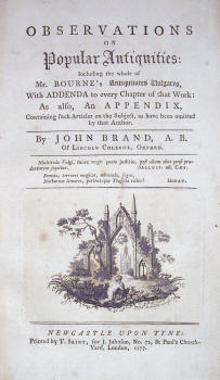 Observations on Popular Antiquities by John Brand. Newcastle Upon Tyne: Printed by T. Saint; London, 1777. Signed binding by James Toovey. Finely bound in full brown morocco leather with gilt-ruled covers and a gilt-decorated and lettered spine. Front hinge is tender and starting to tear at the top. Corners are lightly bumped and the spine top has some chipping. The interior is lightly toned with some foxing. 430 pages plus one page errata and one page of ads; 9" tall. - $450